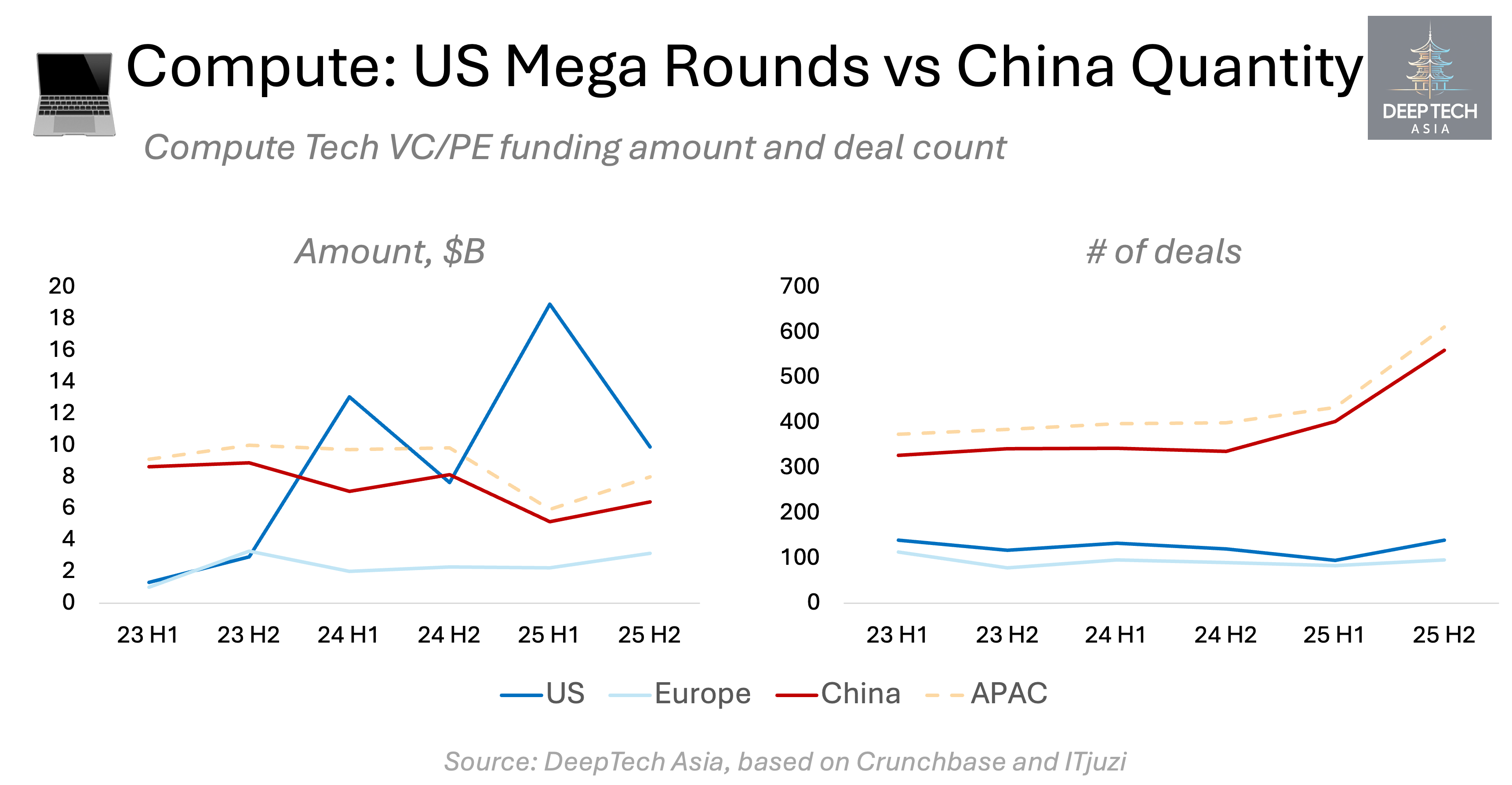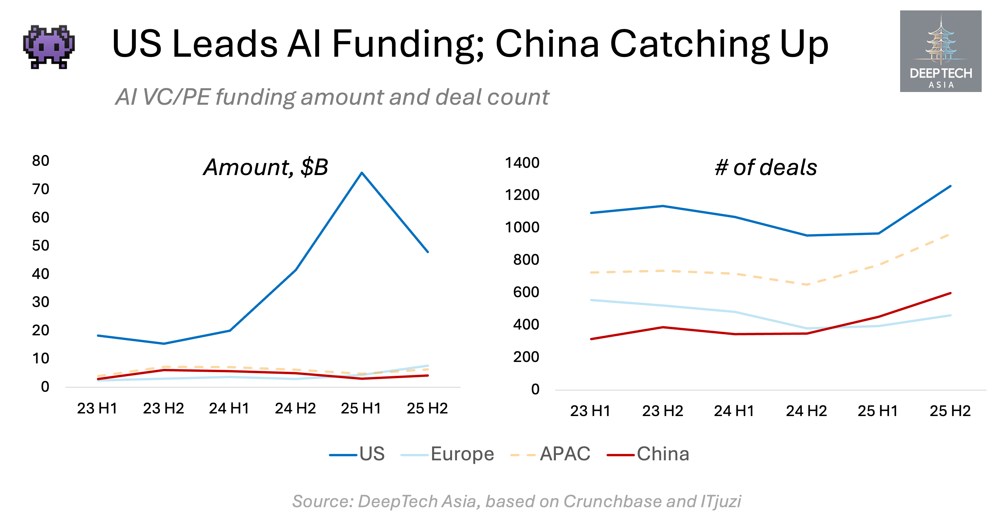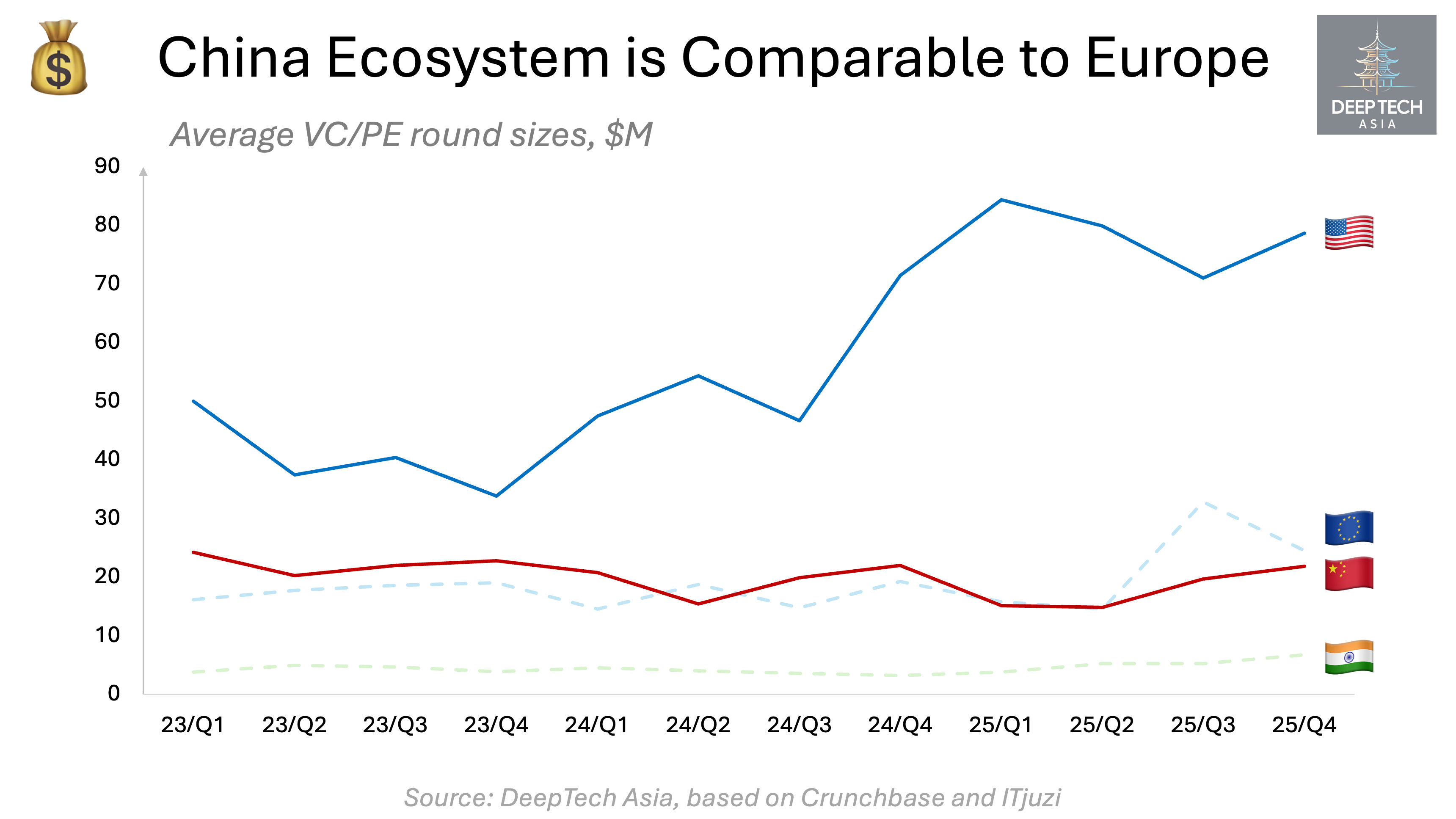 After 2022, despite COVID lockdowns and a prolonged regulatory reset in the tech sector, China’s venture activity continued to expand. By 2024, the number of investment rounds in China had reached parity with the entire European region, including the UK and Israel.