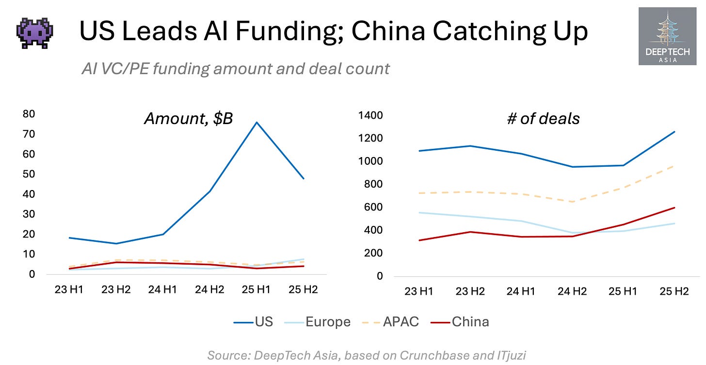 Even so, by 2025 Chinese AI startups surpassed their European peers in deal count. Within APAC, China accounted for approximately 62% of all AI investment rounds, compared with around 20% for India and 12% for Japan.
