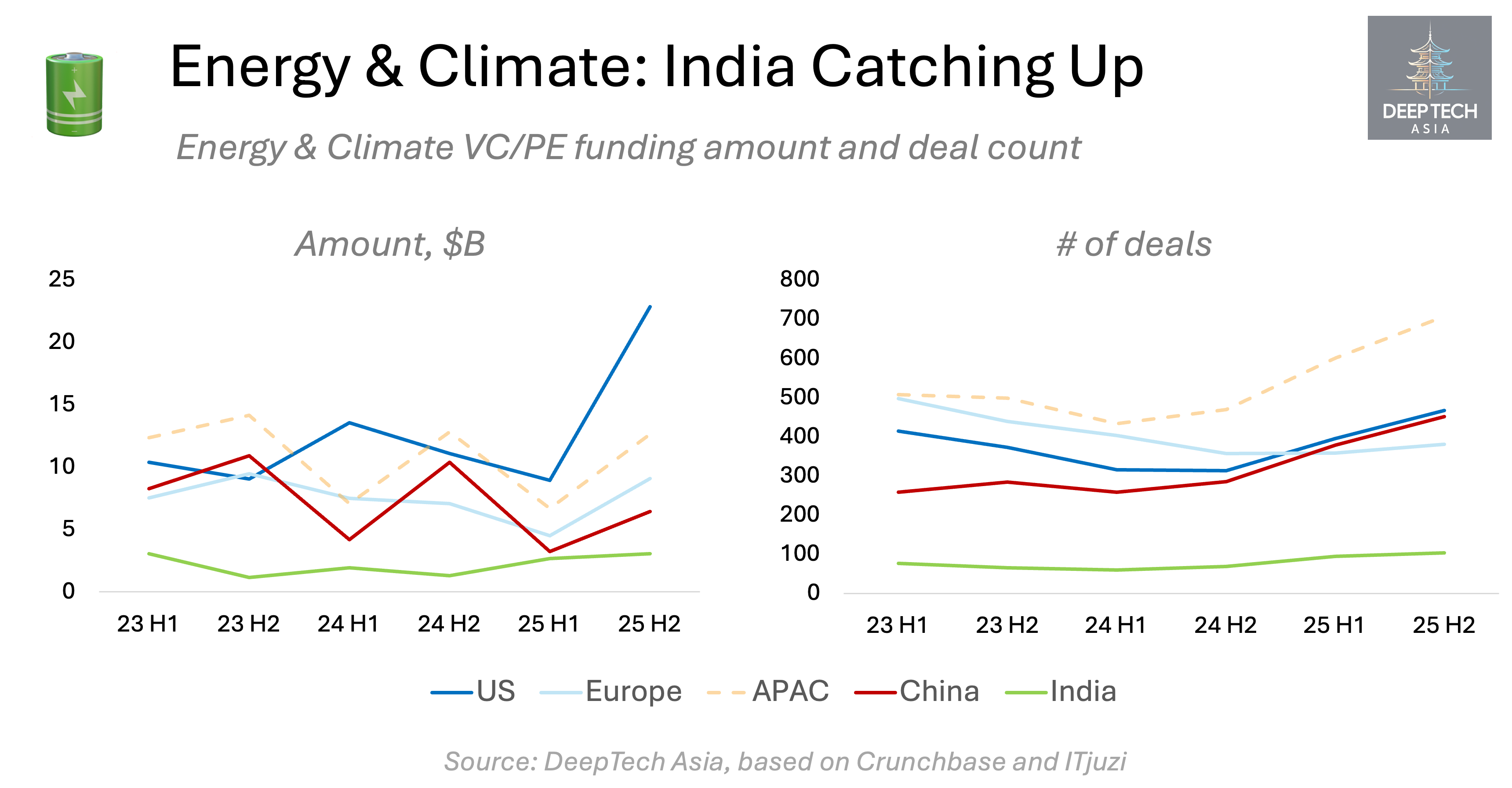 In 2025, India reached 60% of China’s VC/PE investment volumes in energy and climate startups, with projects like Greenko ($1.4B), Inox Clean Energy ($550M), Exide Energy ($420M).