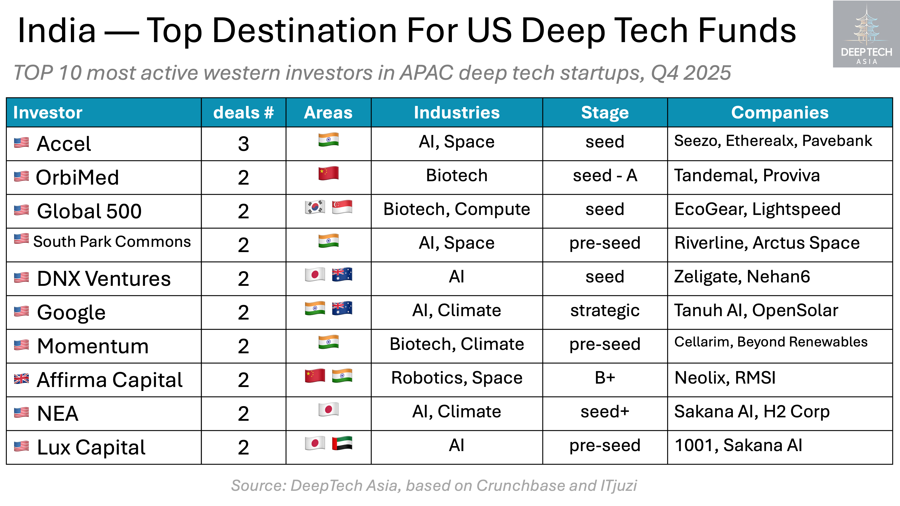 Most Western funds — primarily US-based — continue to concentrate their APAC deep tech exposure in India and Japan. These markets are perceived as carrying lower geopolitical risk, despite being less scalable than China.