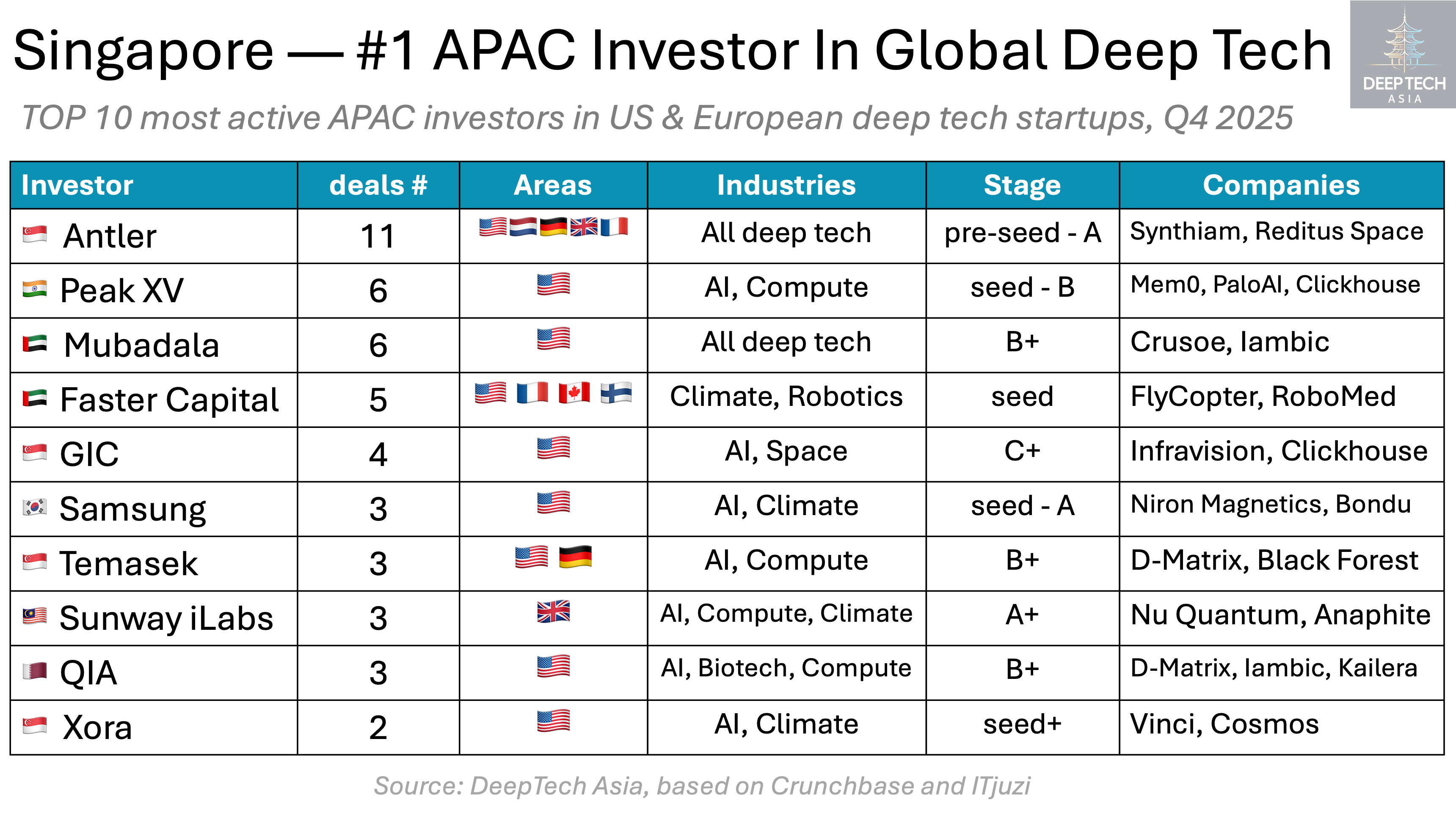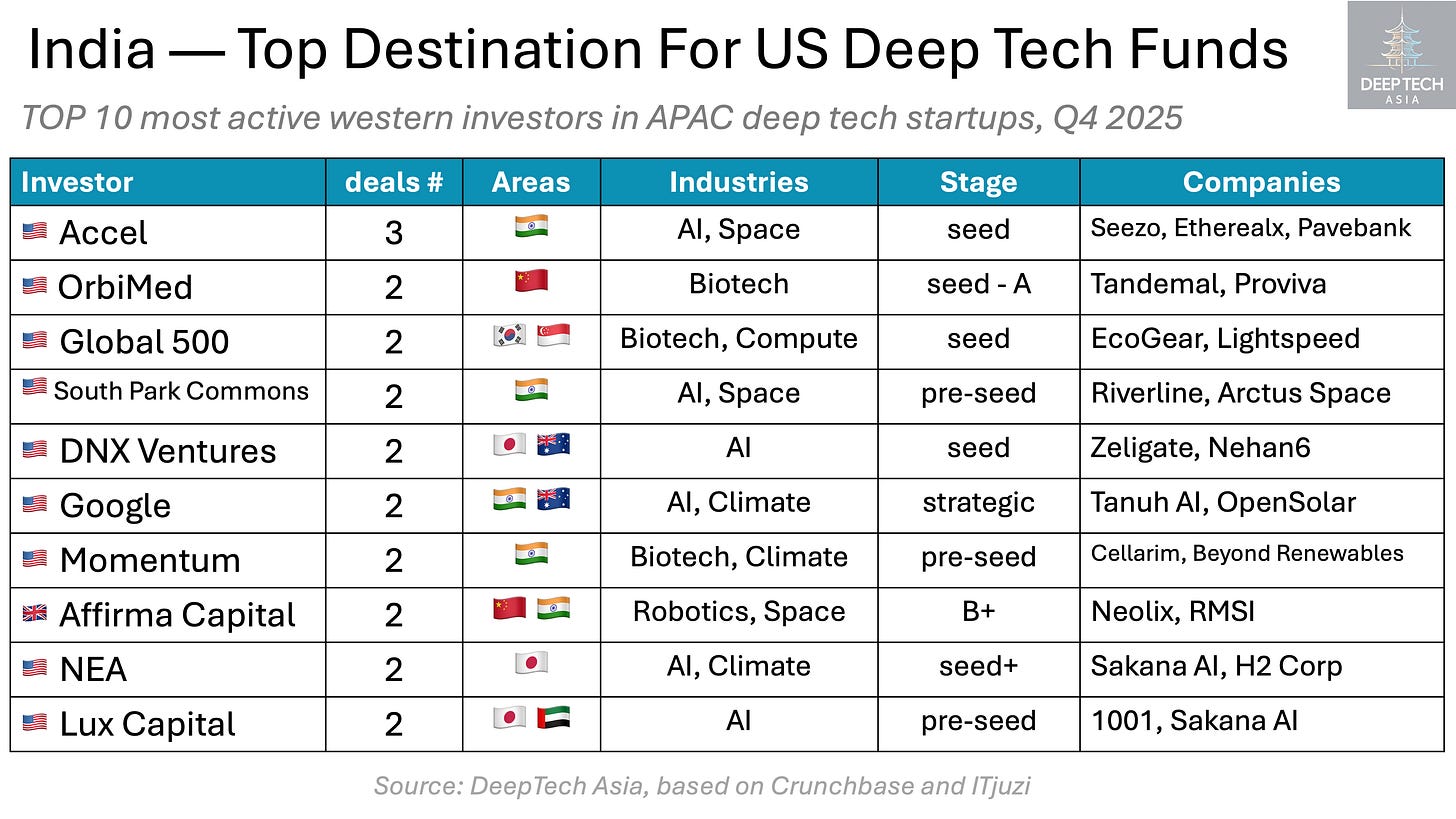 Overall, Western participation in Asian deep tech remains limited. In Q4 2025, the most active US-based investor in Asia, Accel, completed no more than three Asian deep-tech investments. By contrast, Singapore-based Antler—the most active Asian investor in the US and Europe — backed 11 Western startups over the same period, while Peak XV and Mubadala each made six investments.