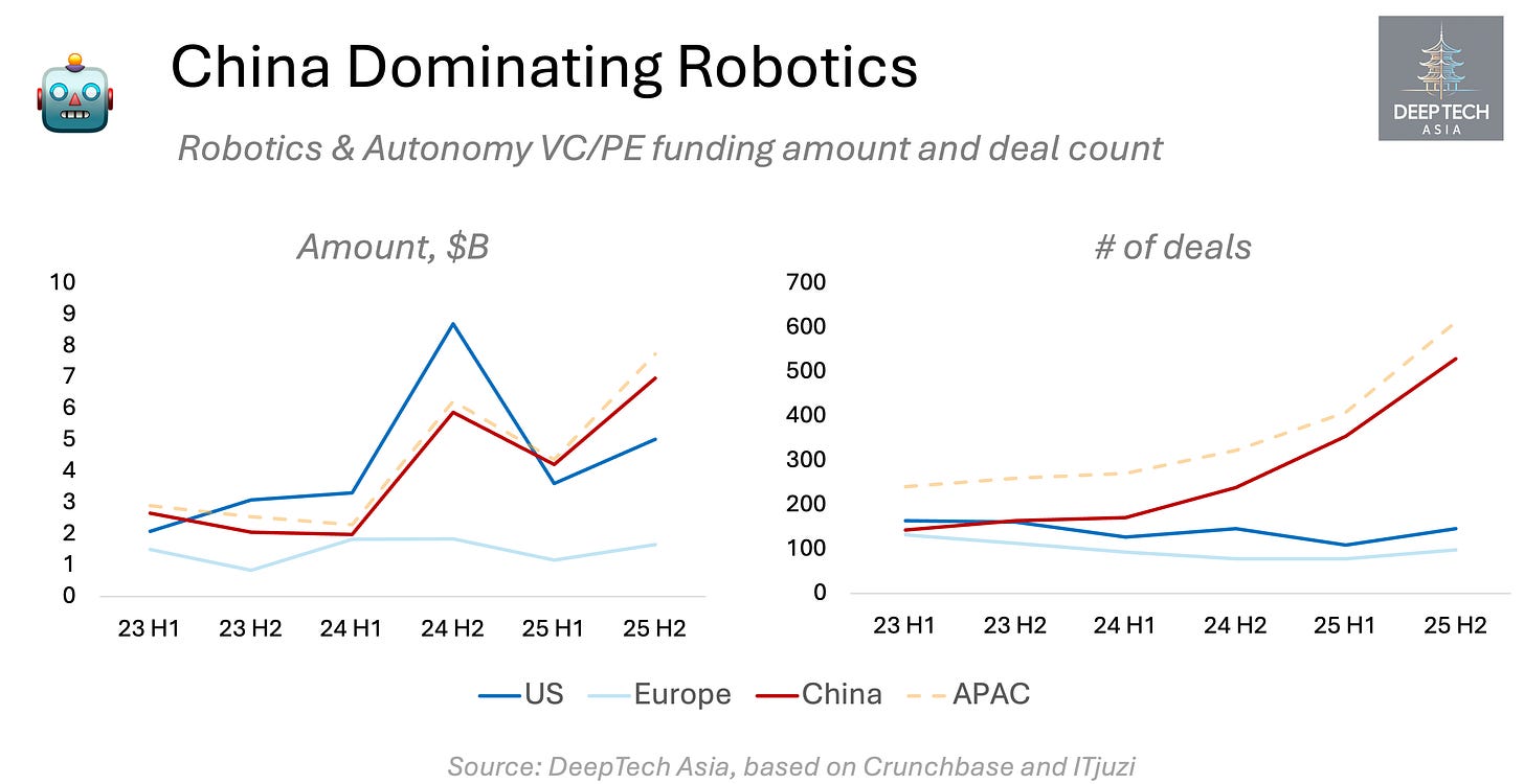 In robotics and autonomous driving, China has already emerged as a formidable force — both in the number of startups raising capital and in total funding volume. Although US has massive companies like Waymo (in talks to raise $15B at $100B+ valuation) and Figure (raised at $39B valuation), China had 50% more robotics investment rounds than the US in 2024 and 3.5x more rounds in 2025.
