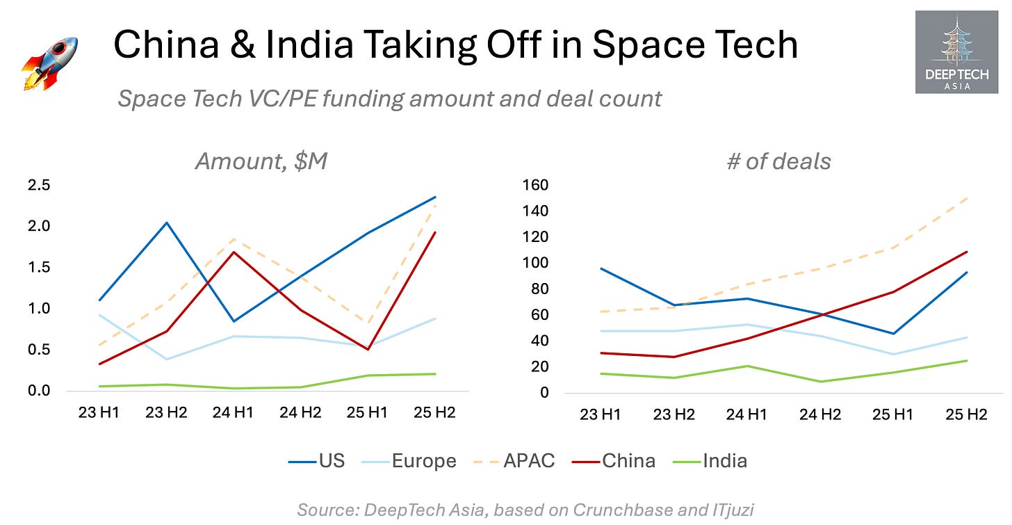 While US space- tech startups attracted more capital than their Chinese counterparts in 2025 ($4.3B vs. $2.4B), China overtook the US in deal activity (187 vs 139) with the rounds like Space Pioneer ($350M), Galactic Energy ($350M), GeeSpace ($280M), Minospace ($147M) and iSpace ($140M).