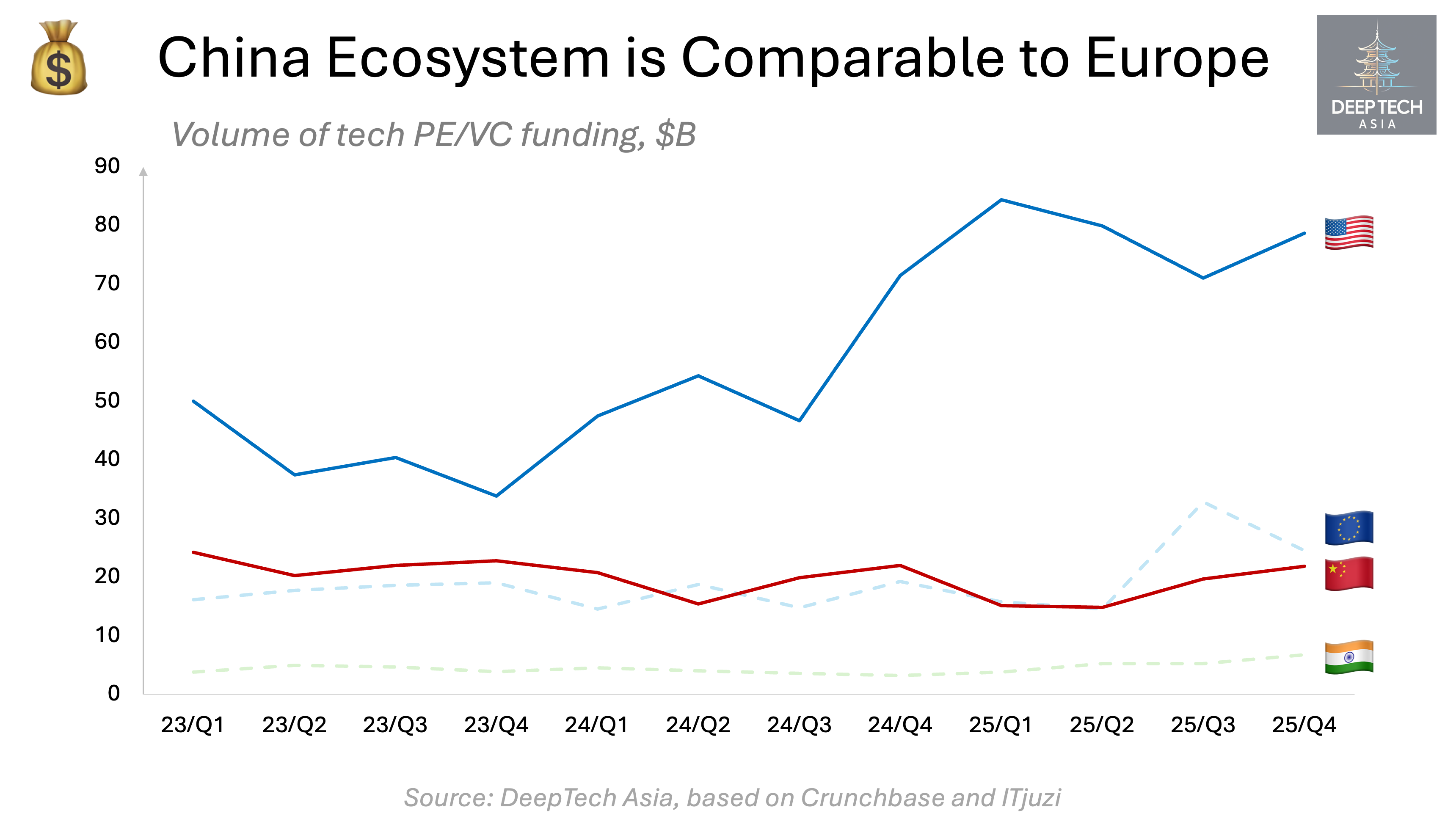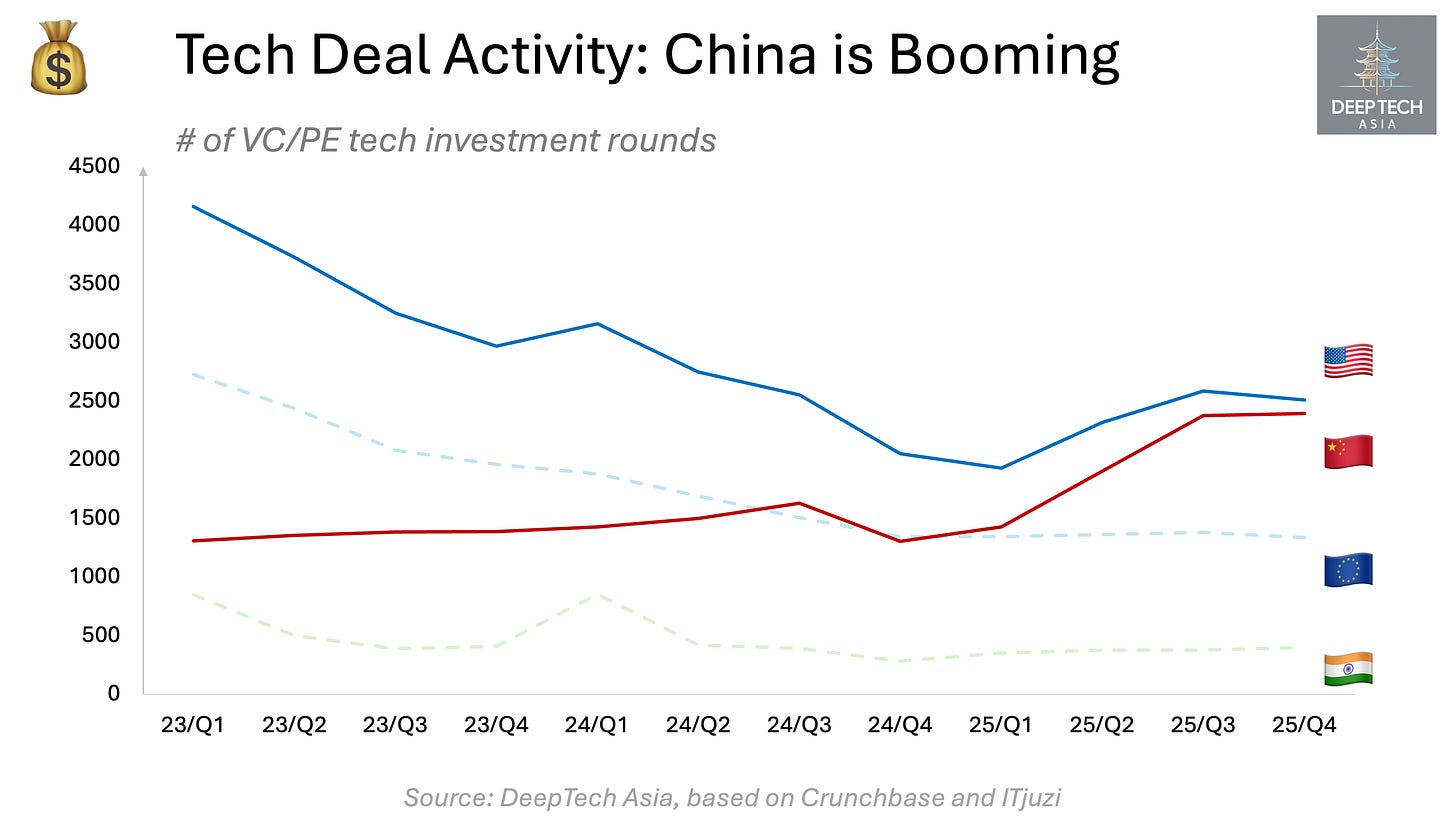 By Q4 2025, China’s tech deal volume exceeded Europe’s by roughly 80% and had nearly caught up with the US.