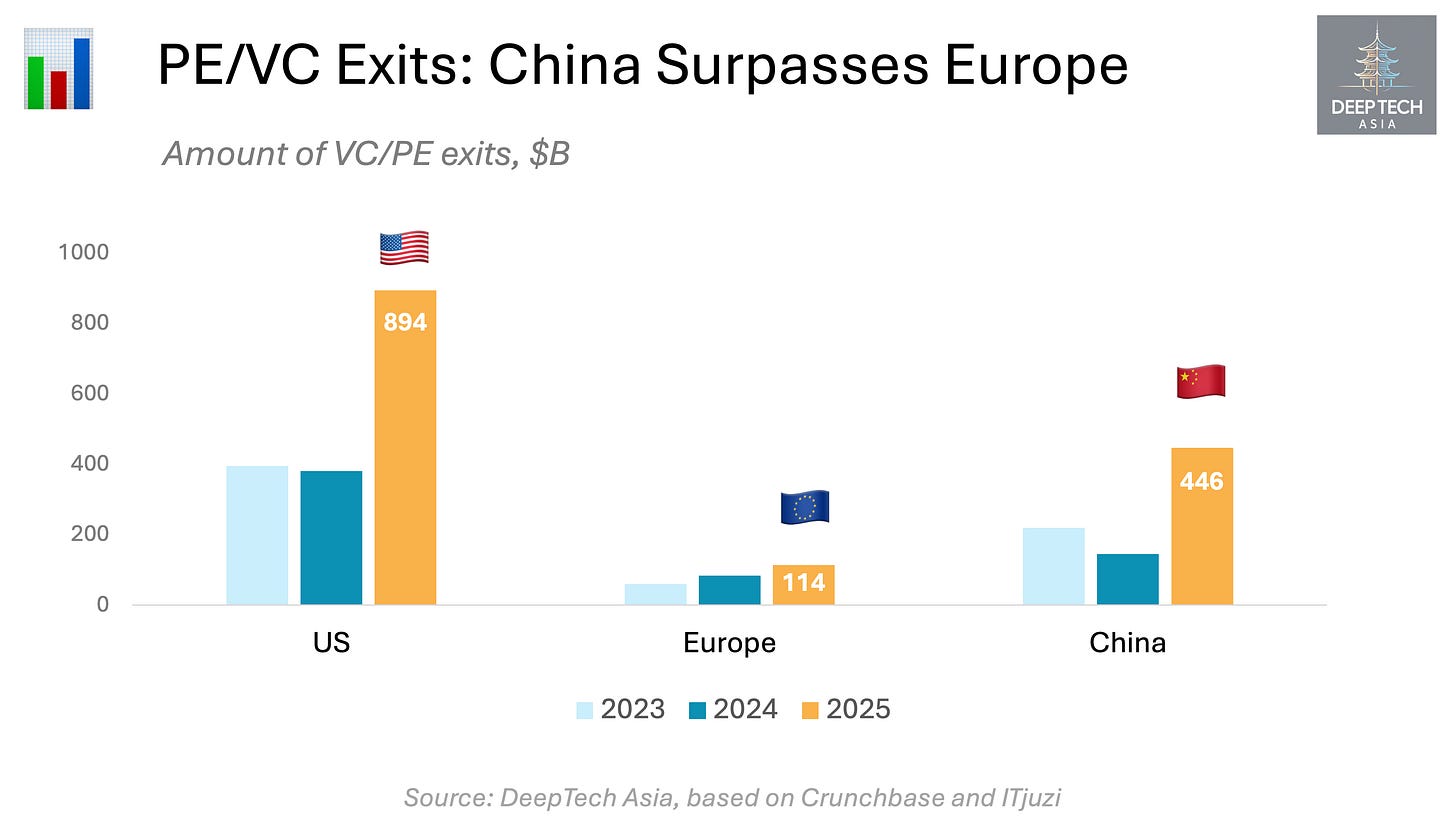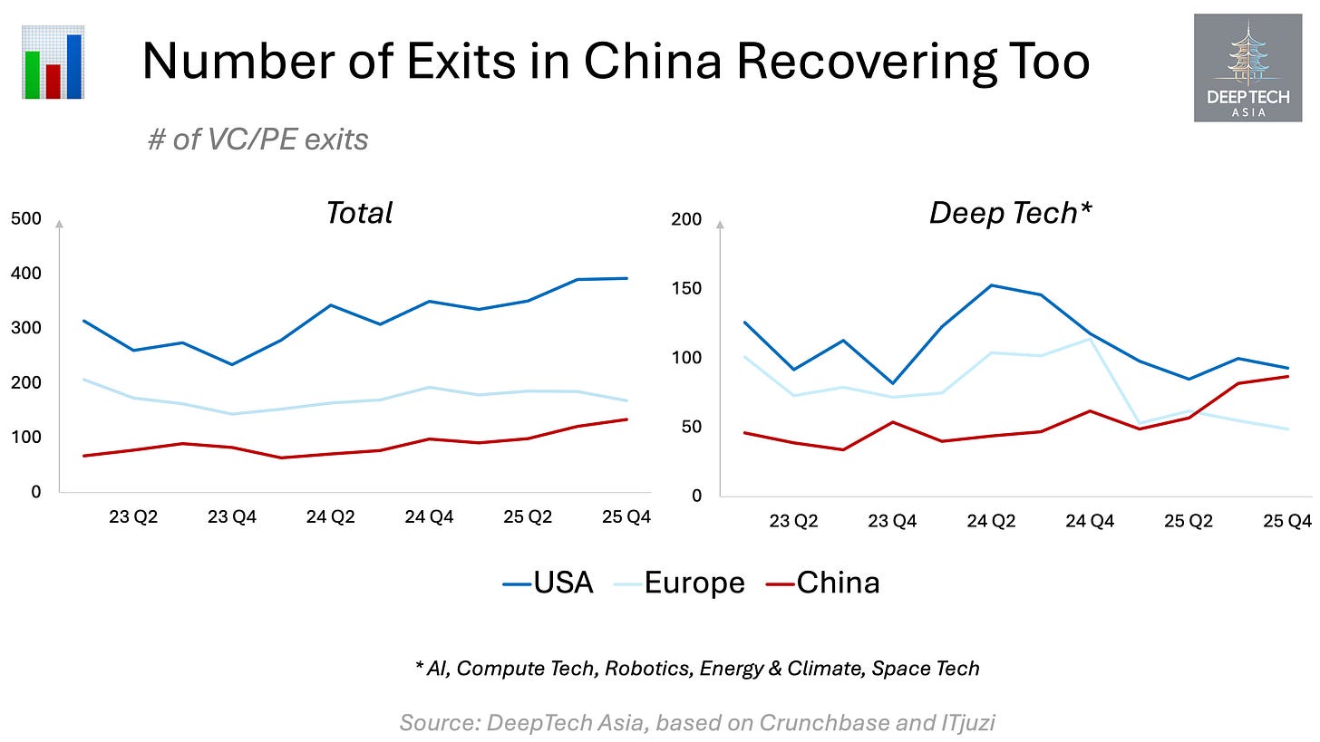 In 2025, this dynamic shifted meaningfully. China nearly reached parity with Europe in total PE/VC exit count and surpassed Europe — while almost matching the US — in the number of deep-tech exits. This acceleration was driven by a sharp increase in both IPO activity (up 70% year-on-year) and M&A transactions (up 36% year-on-year).