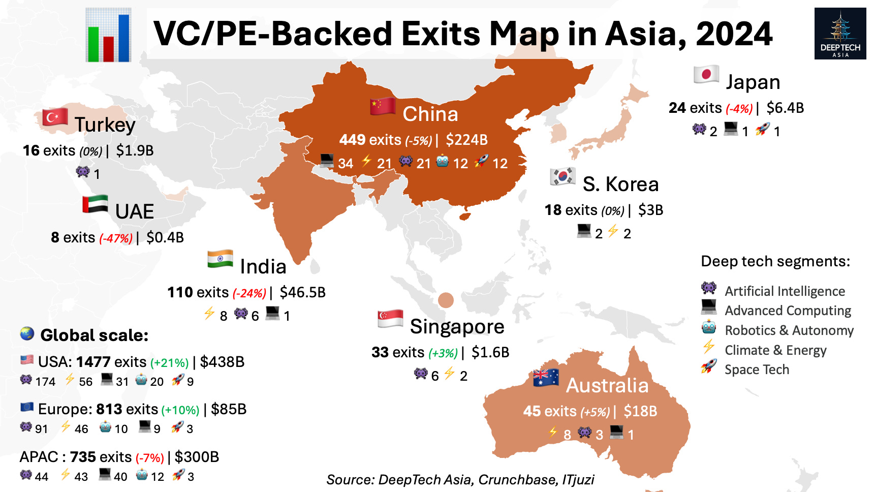 Exits Map in Asia vs Global, liquidity ratio analysis, TOP 15 deep tech exits, deep-dive on China, myth busting and predictions