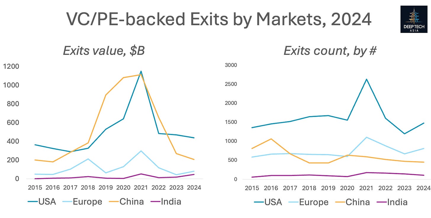 Exit value comparison. In 2024, Asian startups delivered $300B in exits, with China contributing $207B. The US led with $438B, while Europe trailed at $81B.