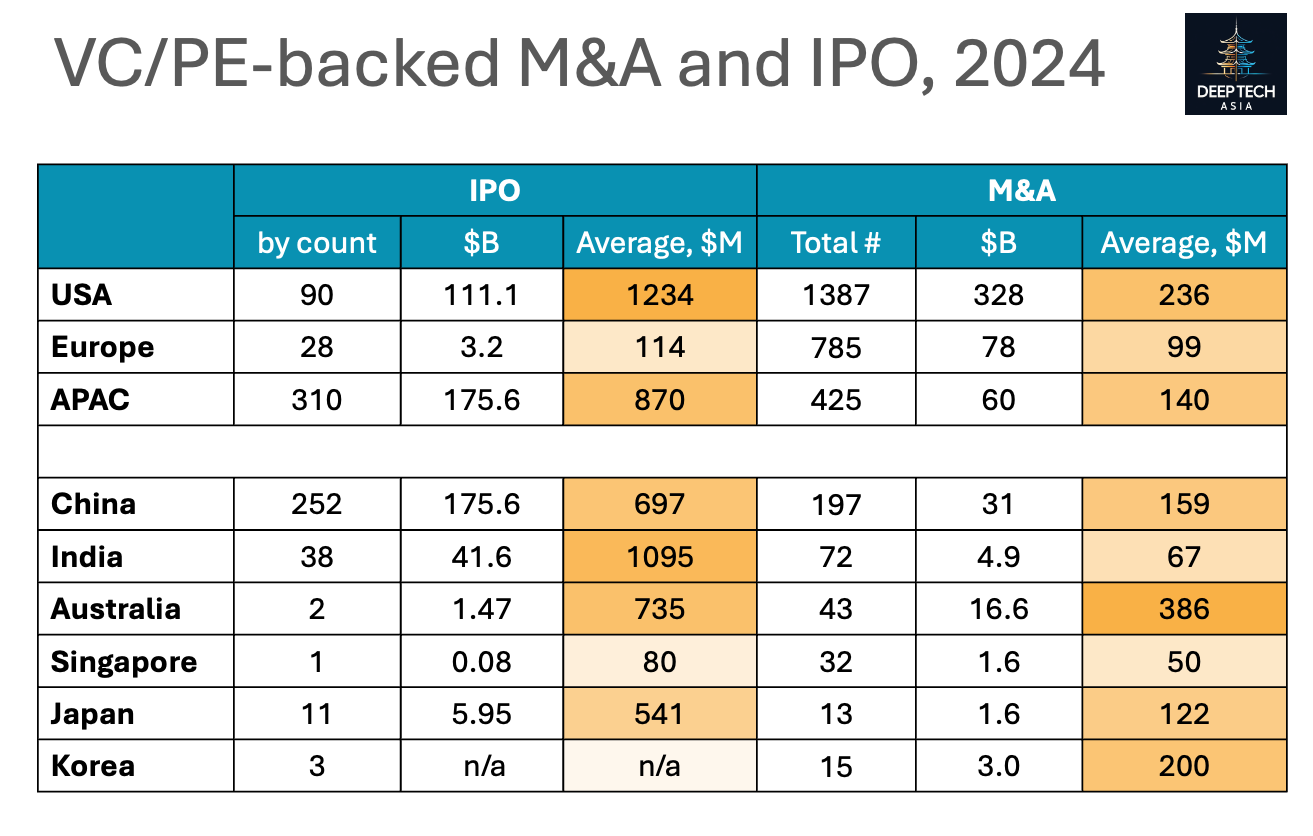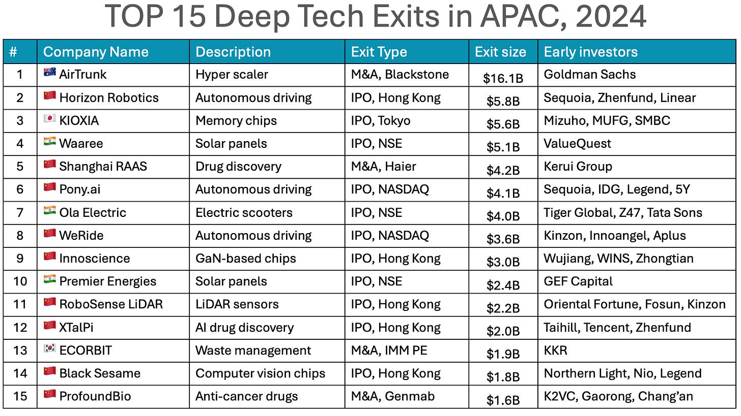 In 2024, China saw substantial amount of massive IPOs, including a lot of listings of deep tech startups, such as Horizon Robotics ($5.8B), Pony.ai ($4.1B), WeRide ($3.6B) and Innoscience ($3B). Some of them were even NASDAQ listings, despite the geopolitical tensions. Also there were some sizeable M&As, e.g. Shanghai RAAS was acquired by Haier and ProfoundBio was acquired by the Danish Genmab.