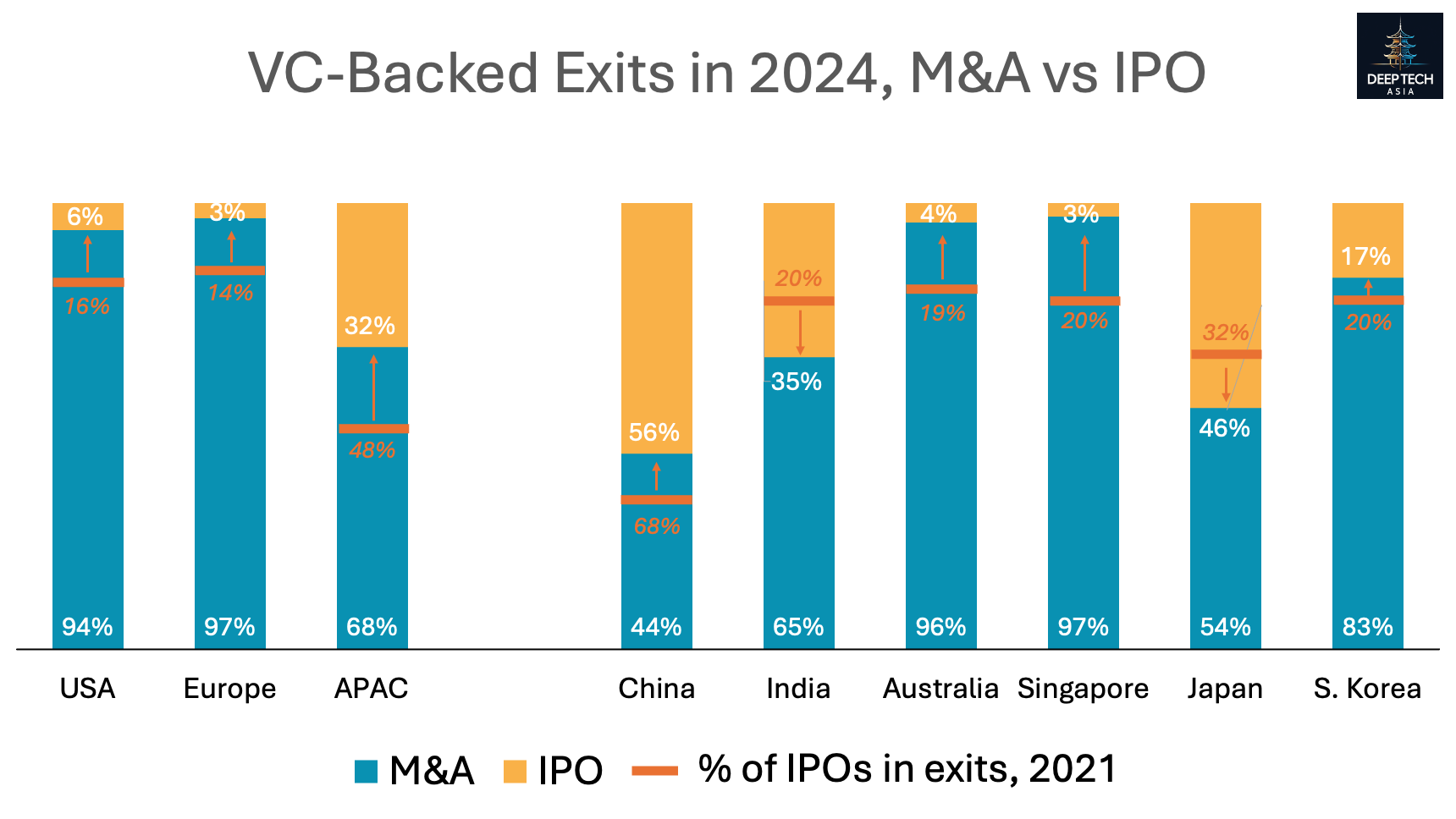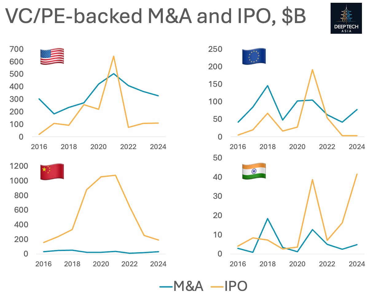 The key difference between Western and Asian VC ecosystems lies in the exit pathways: while the US and Europe are primarily M&A driven, Asia — especially China — is heavily reliant on IPOs.