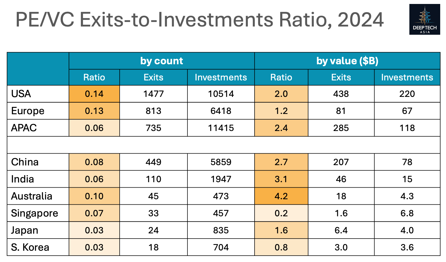 Australia appears highly liquid across both metrics. However, its 2024 exit value data is not very representative — of the $18B in exits, $16B came from a single deal: Blackstone’s acquisition of AirTrunk.