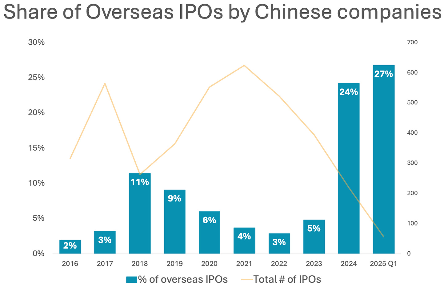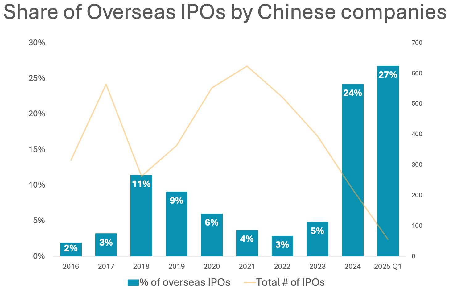 In 2024, 52 Chinese companies went public on overseas stock exchanges — the vast majority of them on NASDAQ. The share of overseas listings among all Chinese IPOs jumped from just 3% in 2022 to 24% in 2024. Chinese companies also made up 26% of all NASDAQ listings that year.