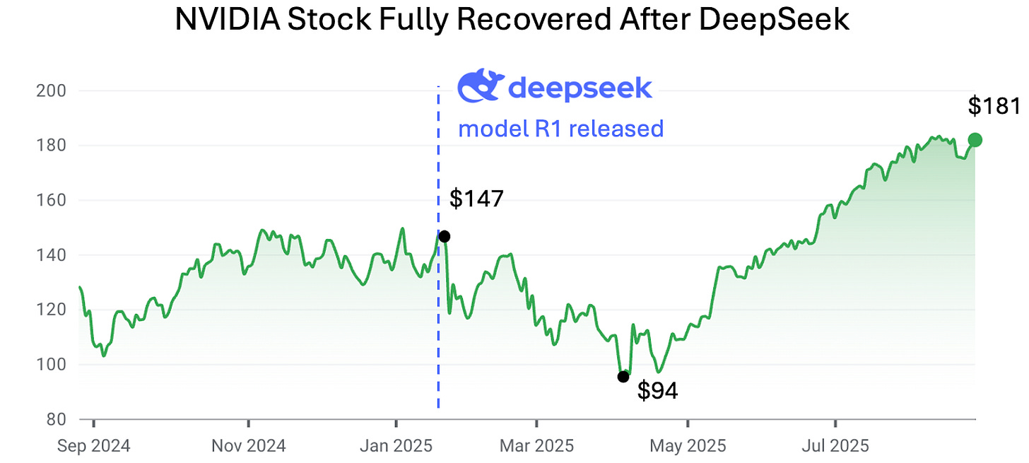 As we can see on the chart, NVIDIA’s stock rebounded by 22% (as of August 27th, 2025) compared to its levels before the DeepSeek-R1 model was released.