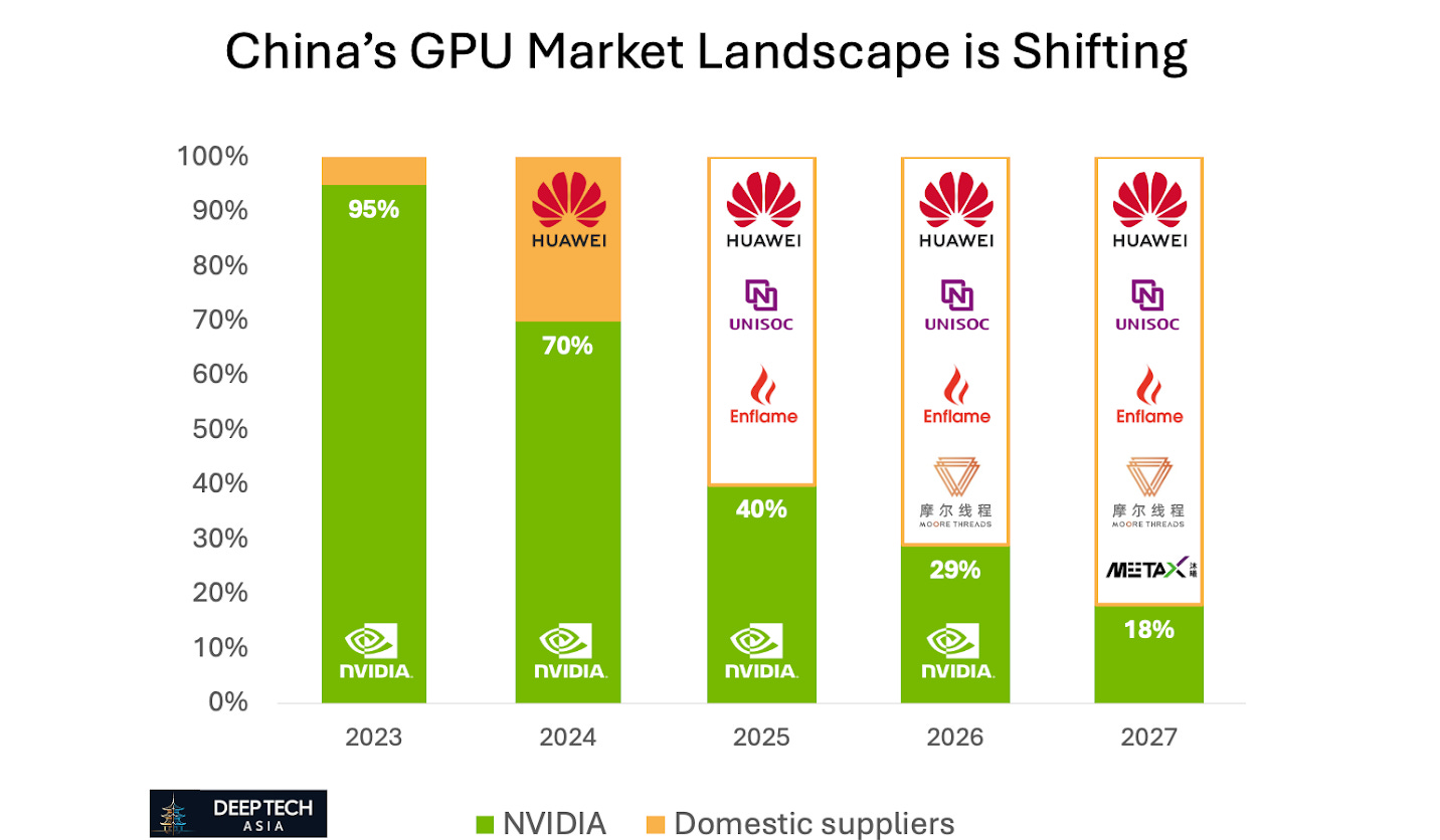 At the same time, the US government imposed restrictions on NVIDIA’s chip sales to China, while Chinese authorities discouraged the use of its H20 processors—going as far as barring major firms such as Tencent, Alibaba, and ByteDance from purchasing them over data security concerns. As a result, Chinese companies are increasingly turning to domestic alternatives like Huawei, UNISOC, and Enflame, a shift that is likely to further erode NVIDIA’s market share in China over the long term.