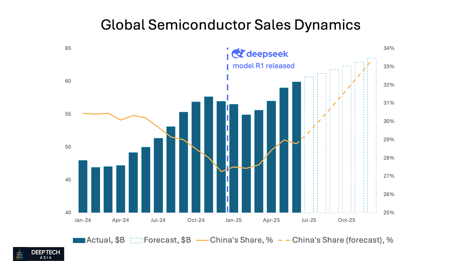 Interestingly, while China’s share of global semiconductor sales had been on a downward trend, this reversed after the release of DeepSeek-R1 in January 2025. Since then, China’s semiconductor demand has begun climbing again, likely driven by increased local training and deployment of AI models.