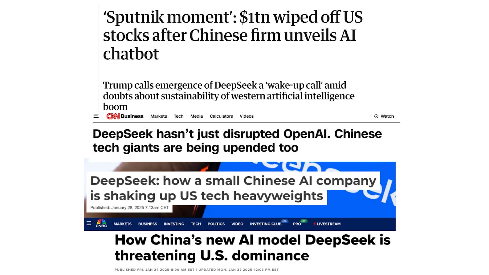 In January 2025, an unknown Chinese startup, DeepSeek, stunned the global tech community with the release of its R1 reasoning model—delivering breakthrough performance at a fraction of the typical training cost. This led to a record NVIDIA stock sell-off. Leading media outlets erupted with apocalyptic headlines predicting the downfall of OpenAI and the collapse of America's tech dominance.