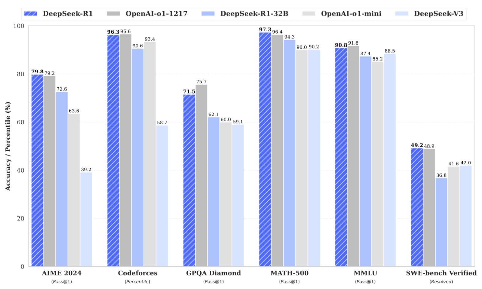 V3 outperforms other open-source AI models and achieves performance comparable to the leading closed-source models, such as GPT-4o and Claude-3.5-Sonnet, while R1 outperforms OpenAI-o1 in most tasks, including reasoning, knowledge and math and is comparable with OpenAI-o1 in coding.