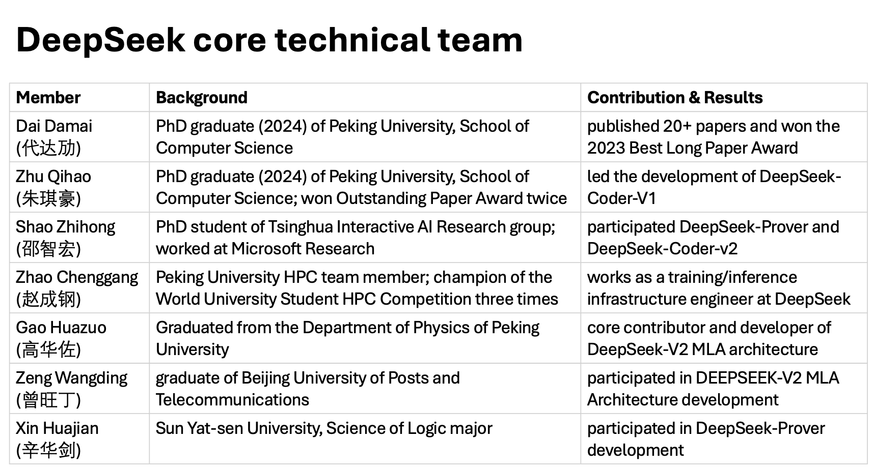 The team of DeepSeek is quite different from other LLM developers, it mainly consists of young PhD students and fresh graduates from Tsinghua, Peking, Zhejiang and other top-tier Chinese universities. Despite the young age, many of them have impressive background with dozens of paper in Chinese and global scientific papers and multiple championship titles at IT competitions.